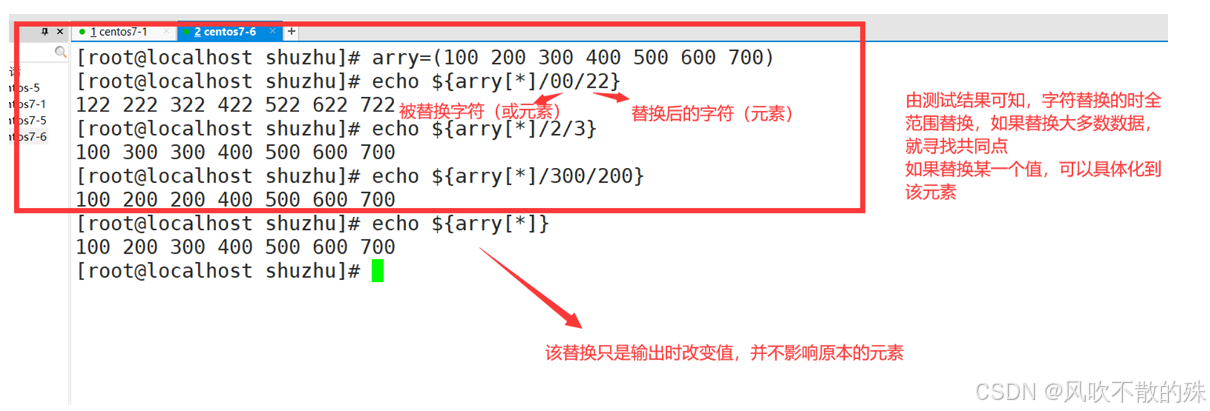 格式: echo ${数组名[*]/被替换的字符或字段/新的字符或字段}