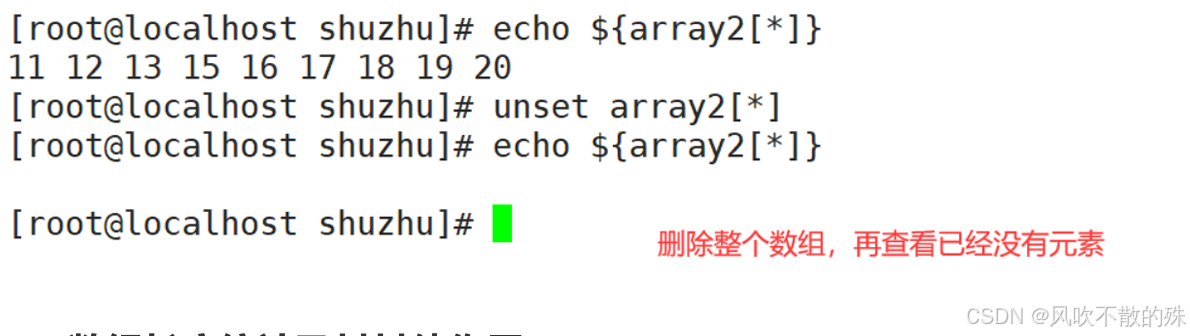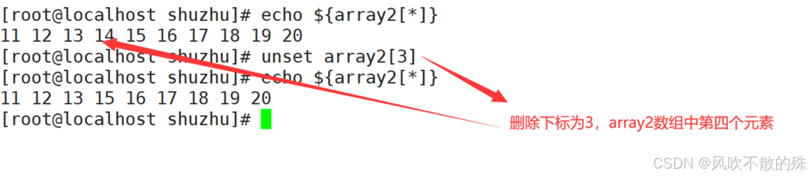 格式: unset 数组名[N] 其中N为存在元素的数组下标(不存在也能操作,但是没有意义)