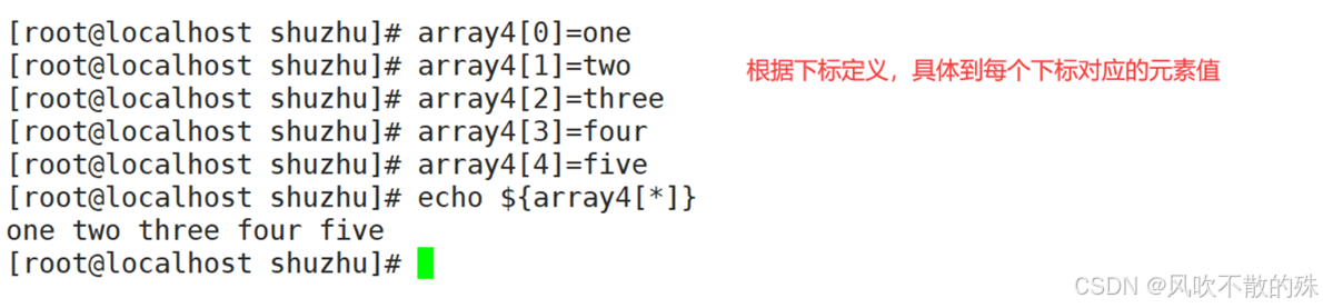 我们用方法四定义数组元素值时,可以随意指定下标位置,但与此同时中间的有些数组下标中的元素就成了空值 。