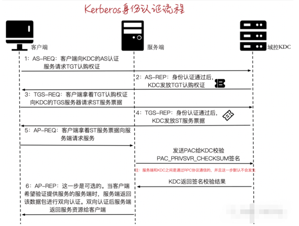 5:AP-REQ:客户端拿着ST服务票据向服务端请求服务(服务端发送PAC给KDC校验PAC_PRIVSVR_CHECKSUM签名。注意服务端和KDC之间是通过RPC协议通信的,并且这步默认不会发送。KDC返回签名校验结果)