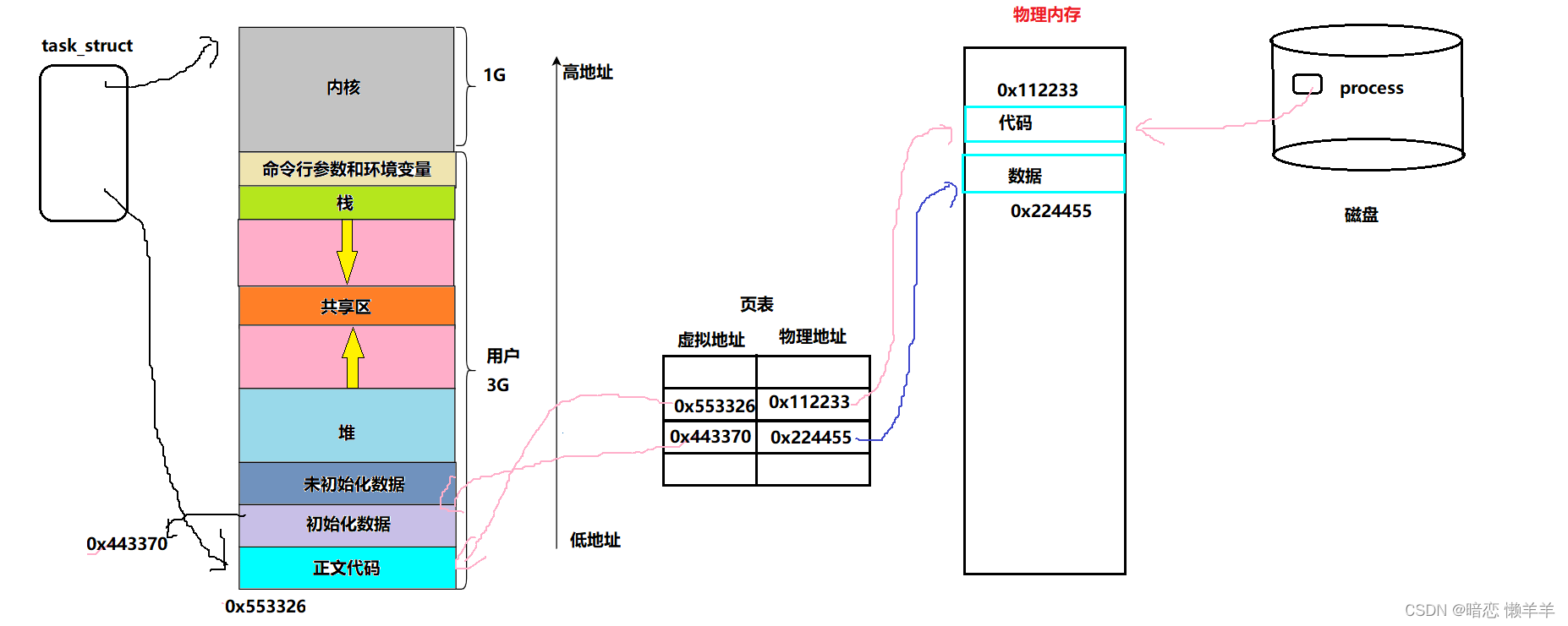不过当时在C语言和C++没有介绍是因为,这个东西本身就不是语言的问题,而是操作系统层面的知识!例如上面的例子,如果没有学系统,看到上面的代码后三观直接震碎!OK,言归正传,继续上回到虚拟地址空间上,以前我们介绍过:当一个进程在被调度时,会先把他的代码和数据加载到内存,然后操作系统会为其创建一个PCB(task_struct)来描述该进程的属性,并把PCB以某种数据结构组织起来,方便管理,即"先描述,在组织"!其实,当一个进程加载到内存时系统并不会只创建一个PCB,还会创建地址空间和页表来一起管理该进程!