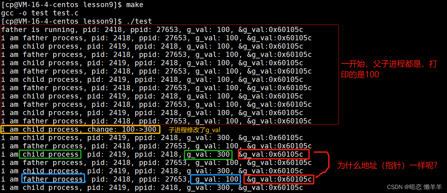 这里的结果是,前5秒父子进程都是打印的100,5秒后子进程把g_val修改了变成了300, 所以以后子进程的g_val就是300,而父进程的不变!这一点也可以理解,我们知道进程=task_struct(PCB)+其代码和数据;fork之后产生了子进程,而子进程的本质是在操作系统中多了一个进程即多了一套task_struct(PCB)+代码和数据,而以前介绍过子进程的代码是可以继承父进程的,如果子进程不对数据修改,子进程和父进程共享数据(注意:这里可没说子进程继承父进程的数据!!);这里子进程虽然修改了数据但父子进程具有独立性,所以父子进程数据也得想办法独立,可以理解的!但是让我们震惊的根本就不是这个,而是父子进程的g_val的地址是一样的!按照以往的理解就是一个变量既等于100又等于300,这怎么可能??所以我们可以得出一个结论:上面g_val的地址绝对不是物理地址!!!,不是物理地址(物理内存的地址)那是啥呢?其实这是虚拟地址!!