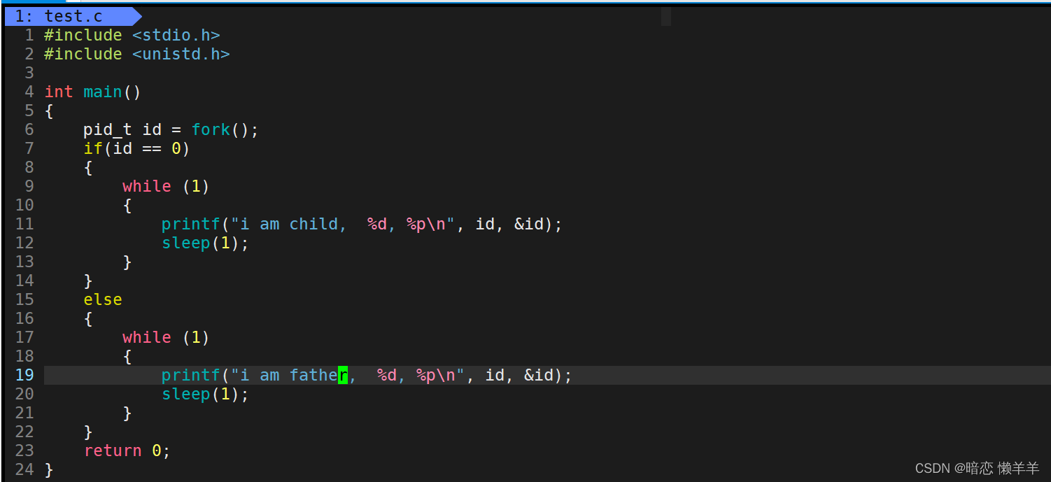 当时看到一个变量的值即是大于0又是等于0,感觉三观直接崩塌了,其实现在介绍了虚拟地址空间后,现在再来看是很好理解的,fork后要return xxx;本质是对同一个变量id的写入,不管是谁先返回即写入就会发生写时拷贝,然后父子进程有了自己独立的物理内存的id而正在虚拟地址层面上他们的地址还是一样的!