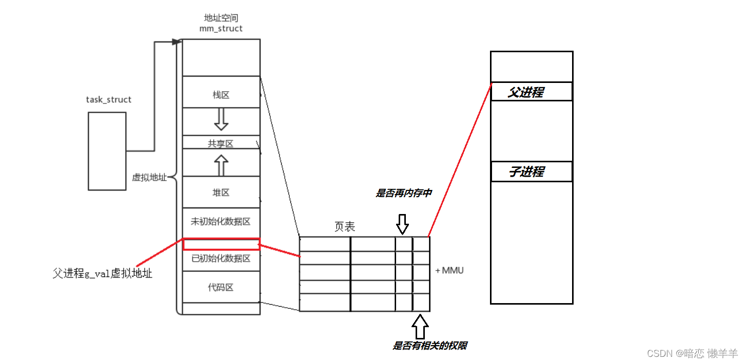 fork之后有了子进程,即有了子进程的代码和数据、PCB、虚拟地址空间、以及页表!其中代码、PCB(pid、ppid等除外)、虚拟地址空间、页表都是继承自父进程的;此时,父进程和子进程的地址空间的内容是一模一样的,所以他们指向的数据也是一样的,即此时数据形成了浅拷贝!也就是我们前面所说的父子进程共享数据,而后面子进程对数据修改了,此时操作系统检测到了之后会对子进程的数据进行写实拷贝(OS自主完成的,用户感受不到),然后让子进程修改,所以子进程修改的是父进程数据的拷贝,所以子进程修改后父进程的g_val不变!这也符合我们介绍的,进程具有独立性!