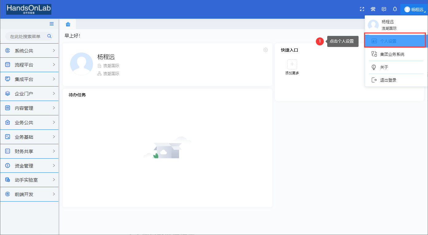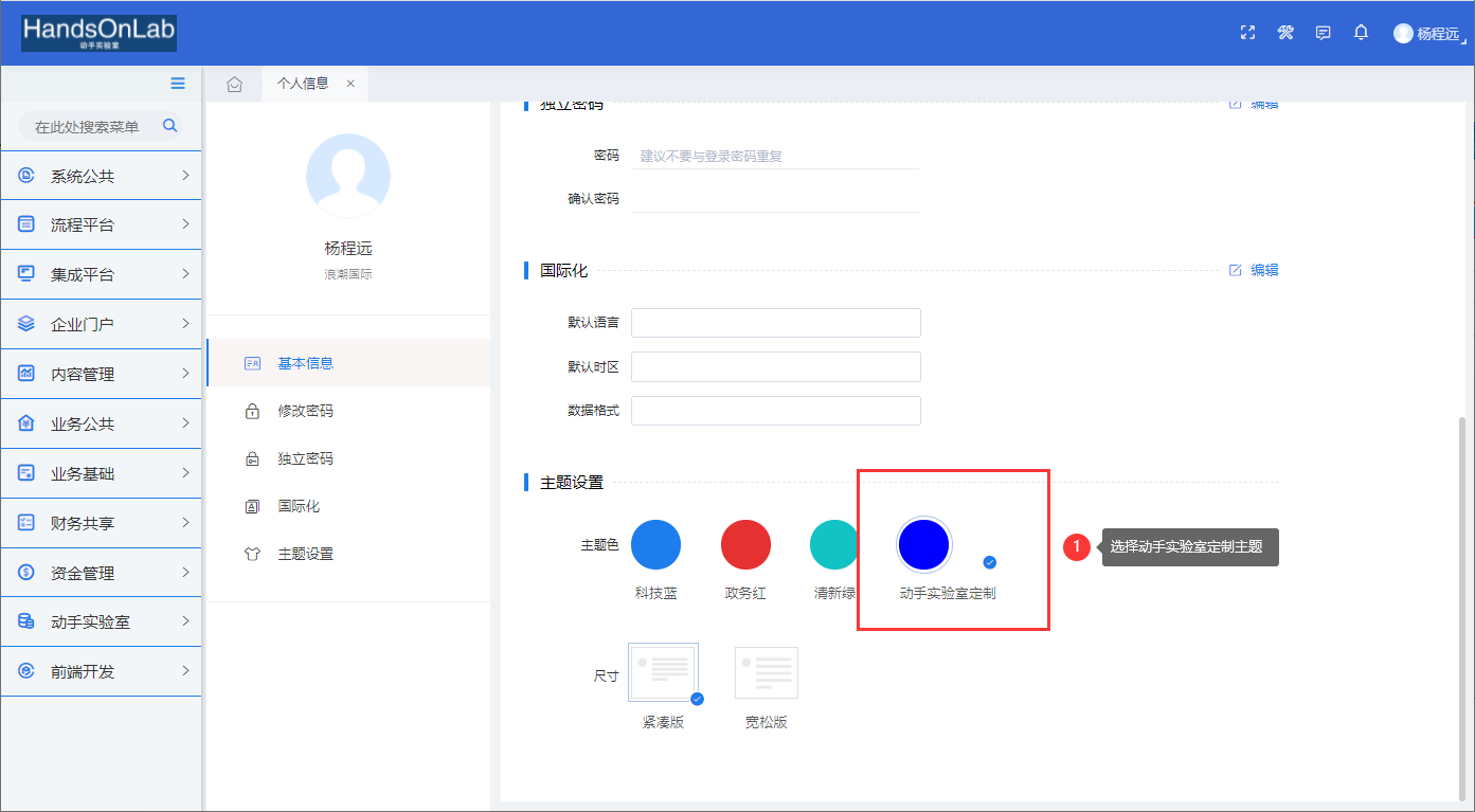 在本例场景1中,即运行效果中第一个界面,修改了主页的Logo和标题,改成了“HandsOnLab 动手实验室”,
