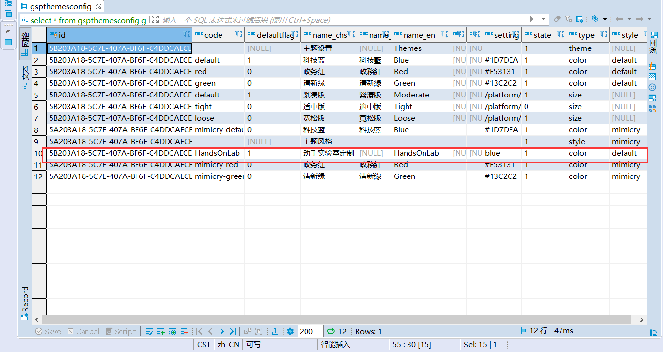 预制主题皮肤数据需要在对应数据库表中预制,主题皮肤配置表为gspThemesConfig ,打开 gspThemesConfig后,手动插入一条数据,即新增一种新颜色的配置,在填写各列值时可参考type值为color的默认配置行中的各列值,需要注意的是要将新增行的”defaultflag”列值设置为1,即设置为默认样式;其余type值为color的配置行的“defaultflag”列值全设置为0。