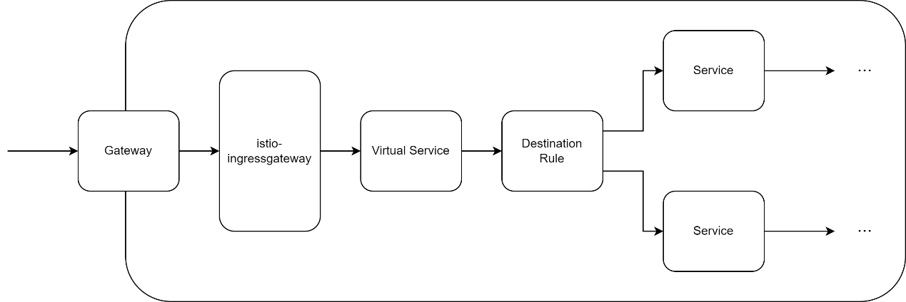 在 Kubernetes 集群环境中,默认配置下的 Istio 将会部署至 istio-system 命名空间下,通过向 pod 中自动注入代理容器,Istio 将 pod 纳入服务网格的管理之中,实现对服务间通信的统一管理和控制。在 istio-system 命名空间中,网关运行时负责处理所有流入服务网格的外部流量。网关运行时将根据 CRD 资源 Gateway 中的定义监听特定的域名与端口,并根据 Virtual Service 与 Destination Rule 将请求智能地路由到后端的 Kubernetes Service,并最终访问到对应的微服务。