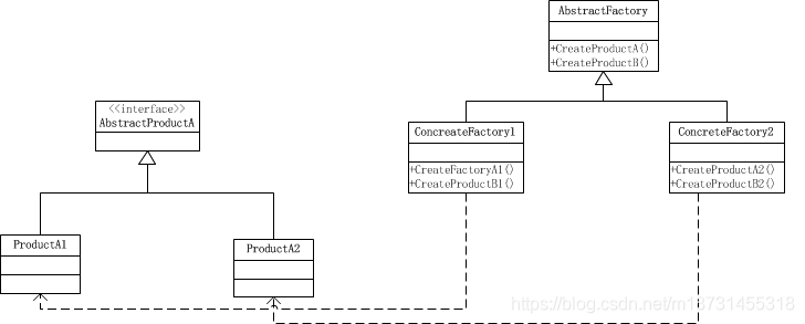 b、抽象工厂:声明生成一系列抽象产品的方法。