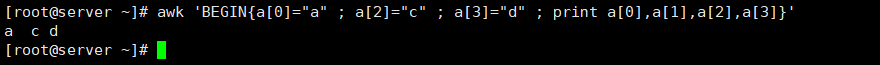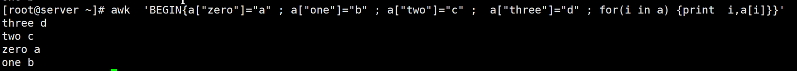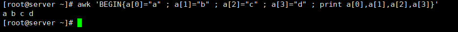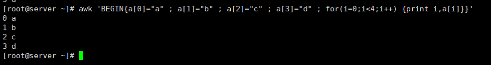 [root@server ~]# awk 'BEGIN{a[0]="a" ; a[1]="b" ; a[2]="c" ; a[3]="d" ; for(i=0;i<4;i++) {print i,a[i]}}'