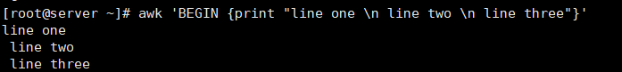 [root@server ~]# awk 'BEGIN {print "line one \n line two \n line three"}'