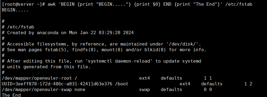 [root@server ~]# awk 'BEGIN {print "BEGIN..."} {print $0} END {print "The End"}' /etc/fstab