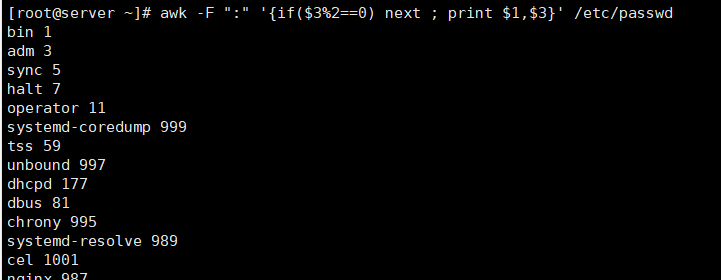 # awk -F : '{if($3%2==1) next;{printf "%-15s%d\n",$1,$3}}' /etc/passwd