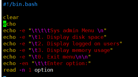 创建菜单的第一步显然是决定在菜单上显示哪些元素以及想要显示的布局方式。在创建菜单前,通常要先清空显示器上已有的内容。这样就能在干净的、没有干扰的环境中显示菜单了。clear命令用当前终端会话的terminfo数据来清理出现在屏幕上的文本。运行clear命令之后,可以用echo命令来显示菜单元素。默认情况下, echo命令只显示可打印文本字符。在创建菜单项时,非可打印字符通常也很有用,比如制表符和换行符。要在echo命令中包含这些字符,必须用-e选项。因此,命令如下: