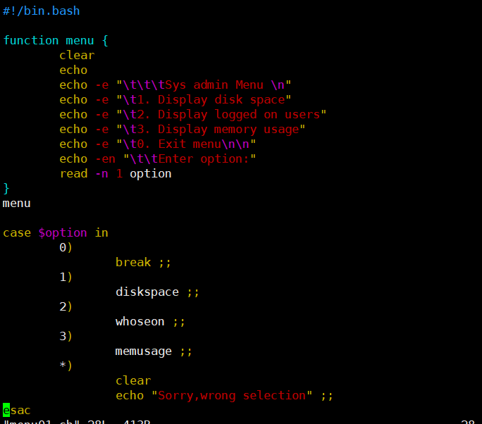 这段代码首先用menu函数清空屏幕并显示菜单。 menu函数中的read命令会一直等待,直到用户在键盘上键入了字符。然后, case命令就会接管余下的处理过程。 case命令会基于返回的字符调用相应的函数。在函数运行结束后, case命令退出。