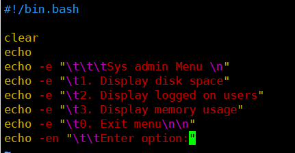 [root@kittod ~]# echo -e "1.\tDisplay disk space"