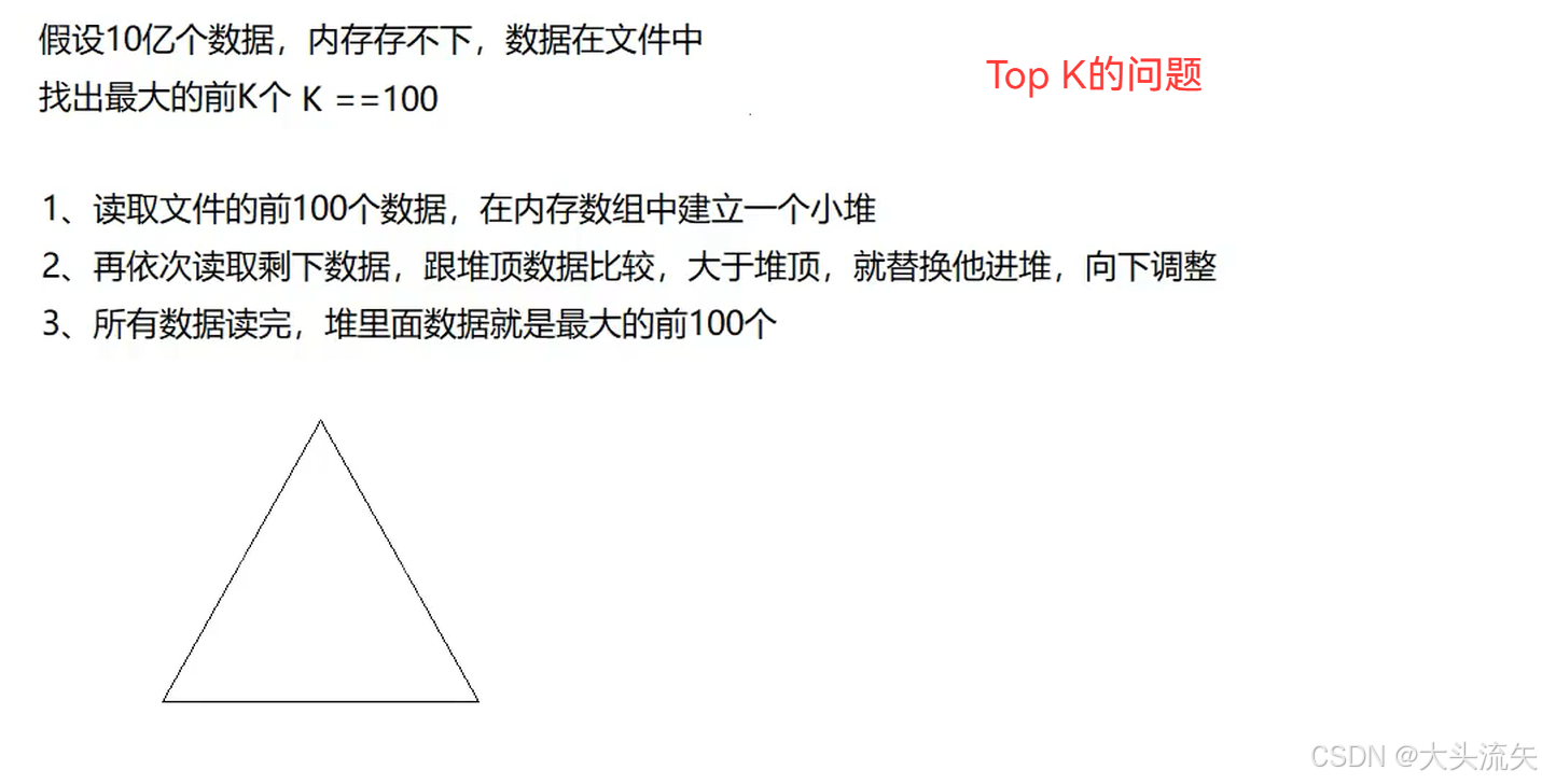 TOP-K问题:即求数据结合中前K个最⼤的元素或者最⼩的元素,⼀般情况下数据量都⽐较⼤。