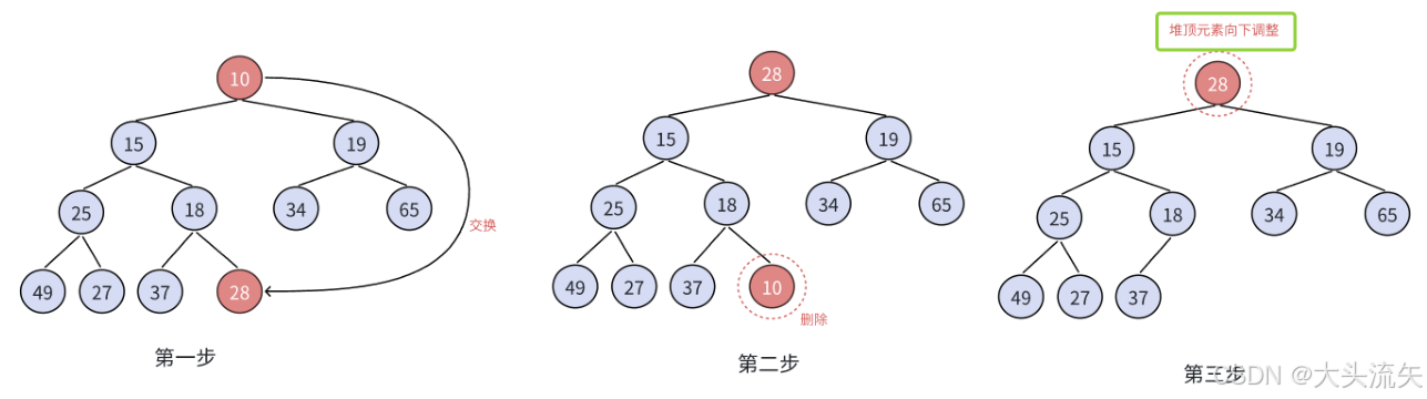 堆删除的话主要就是用向下调整的方法来实现: