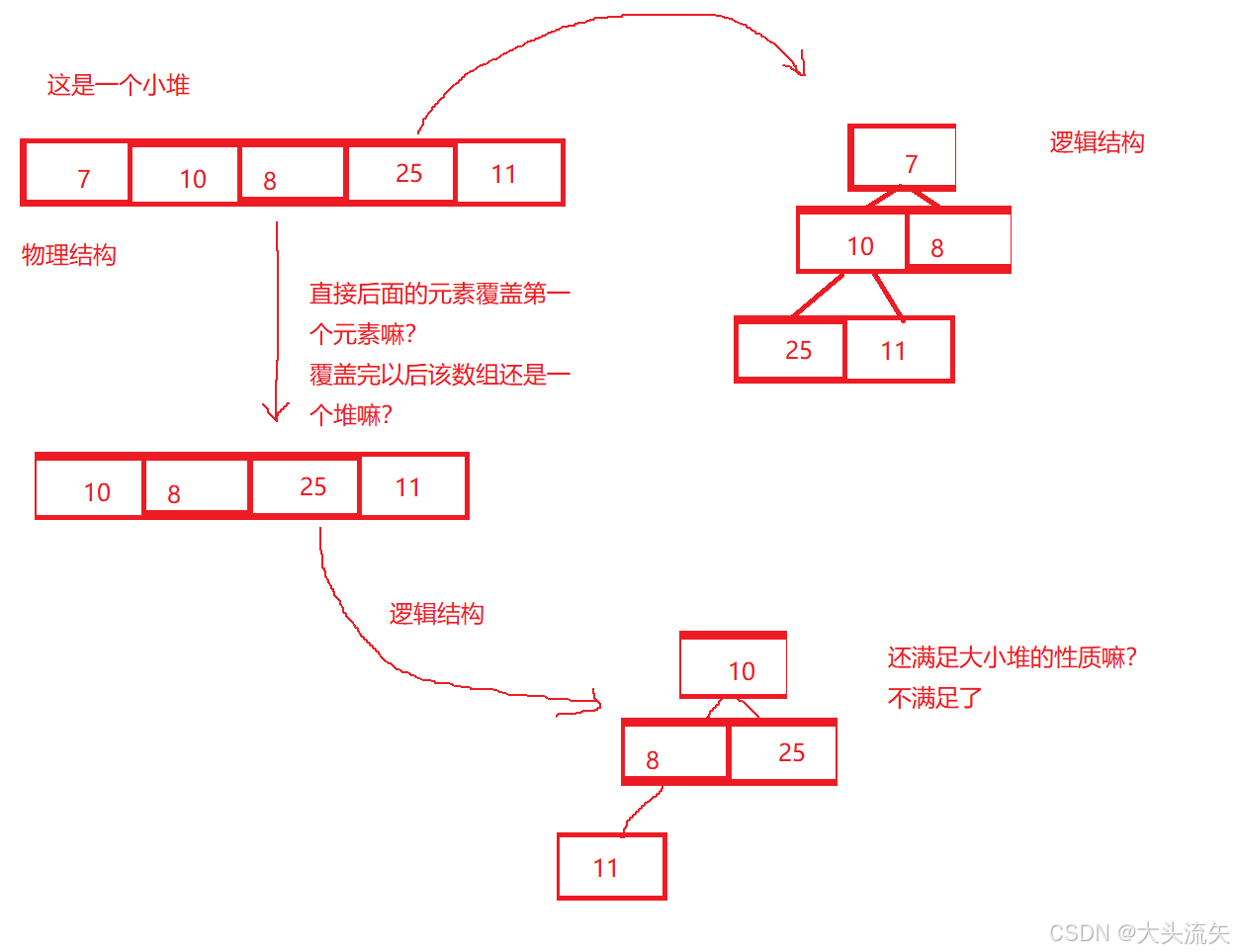 - 核心前提:左右子树均满足堆性质。