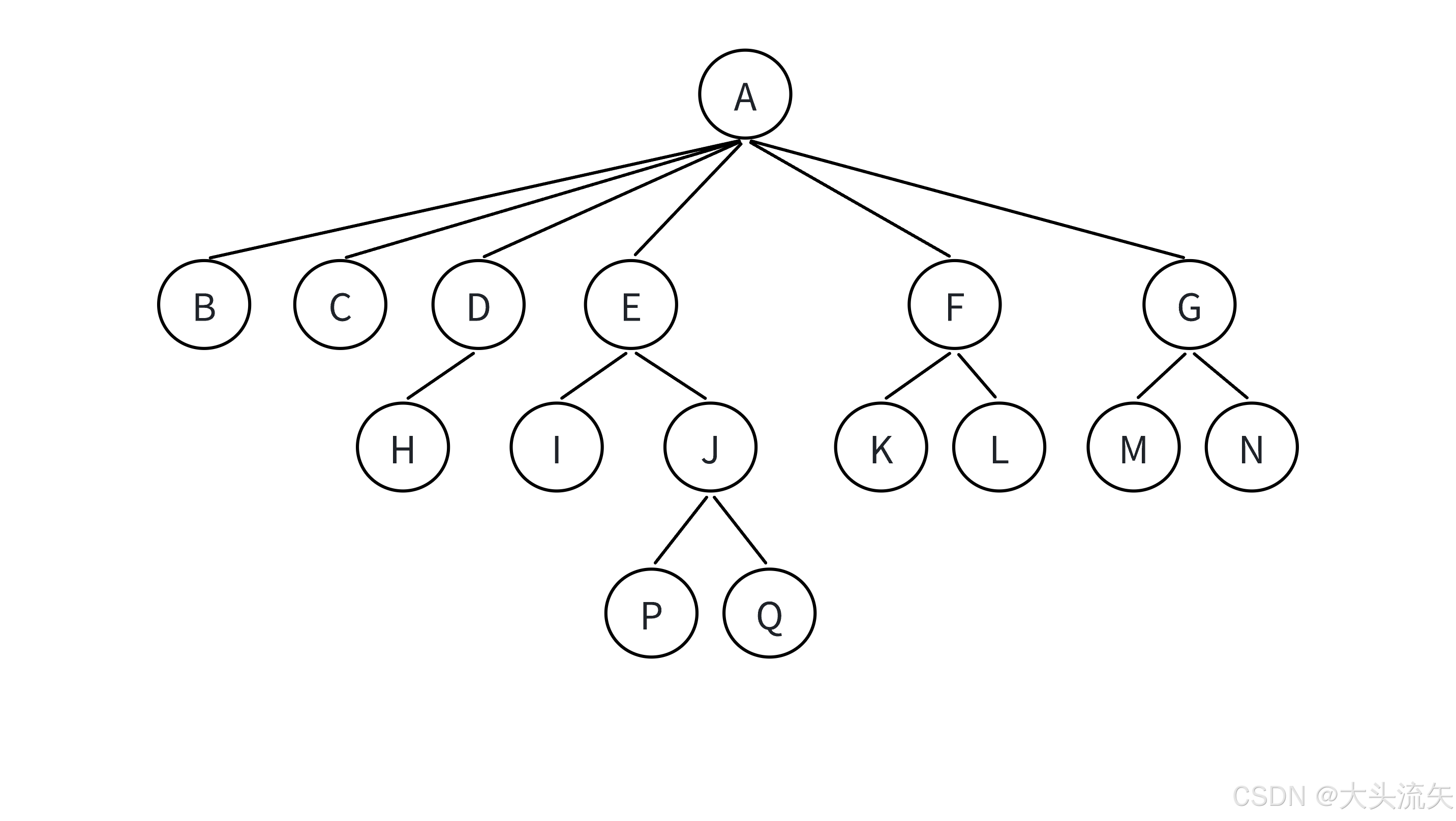 | 叶子结点 / 终端结点 | 度为 0 的结点(没有任何子结点的结点)。 | B、C、H、I、K、L、M、N、O、P、Q 等结点(均无子女)。 |