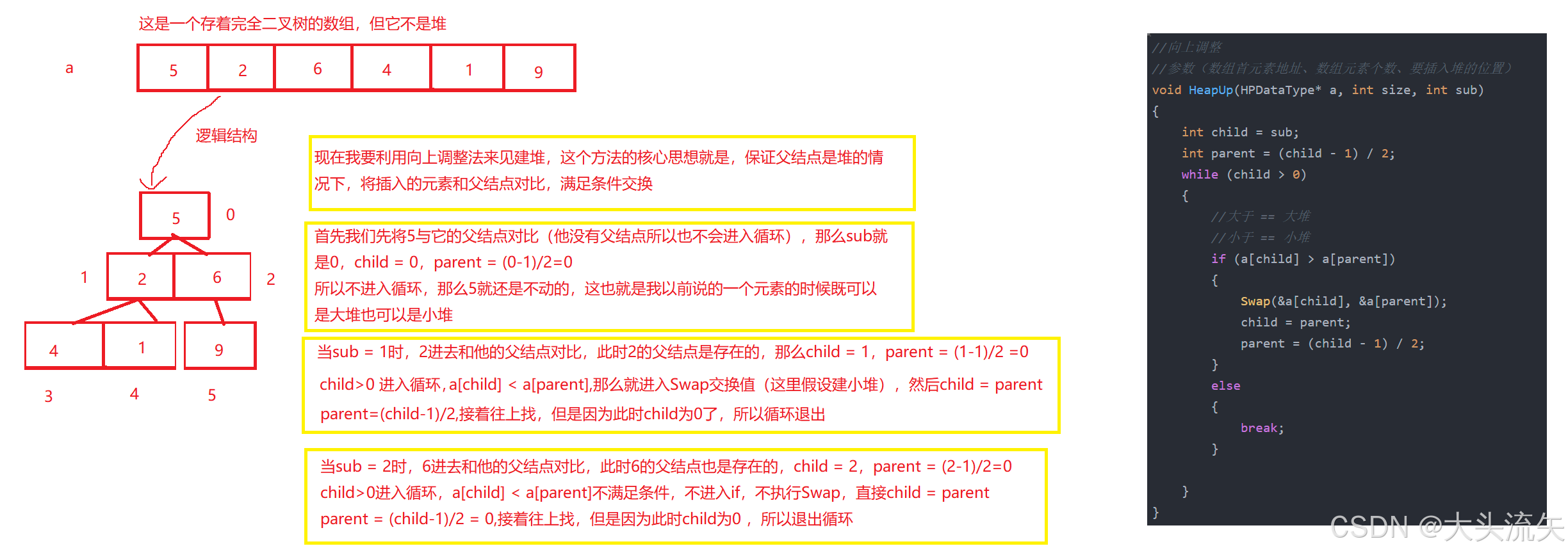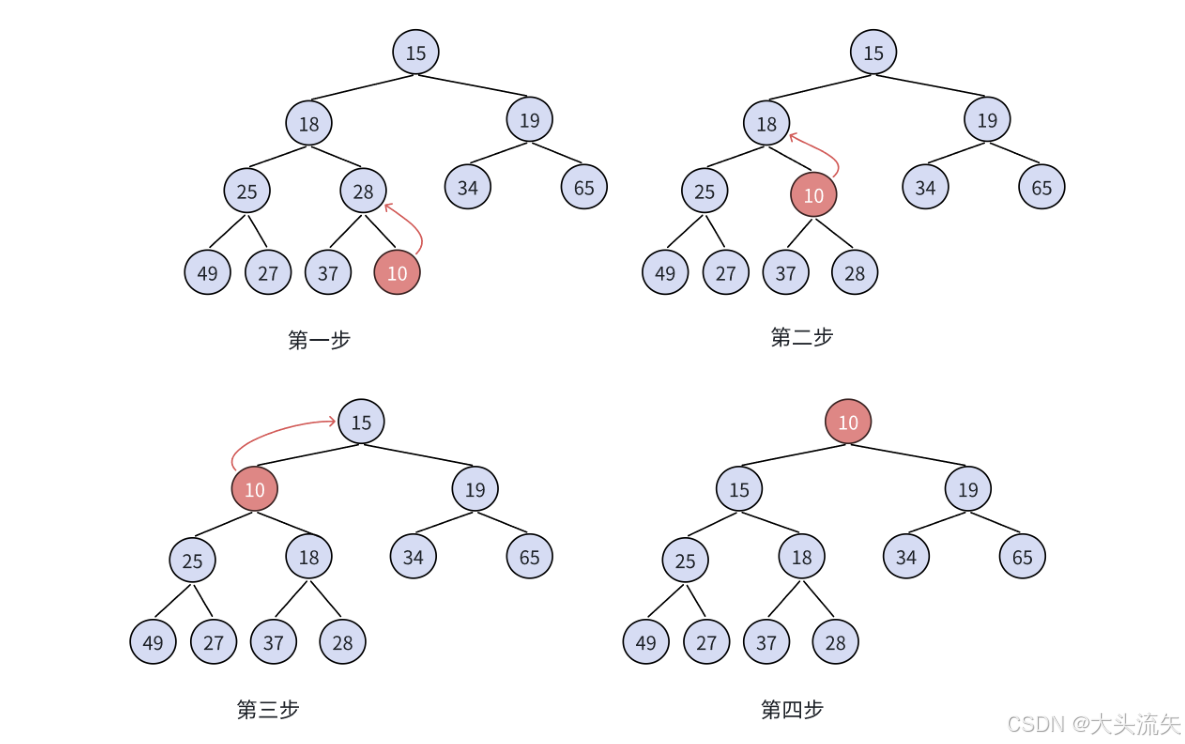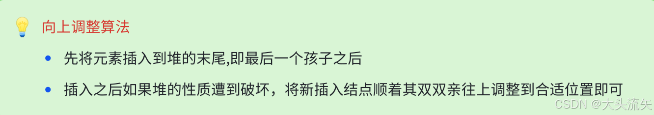- 调整方向:自下而上,新元素和父节点比较交换。