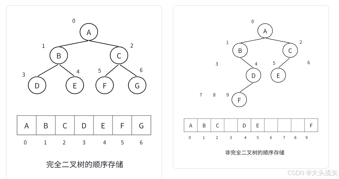 其实我们之前也讲了完全二叉树的逻辑结构上所有的子结点都是相邻的,而这种相邻的结构就非常适合用顺序表数组来存储,反观非完全二叉树,因为子结点存在不相邻的情况,所有在顺表数组中存储就会导致空间的浪费