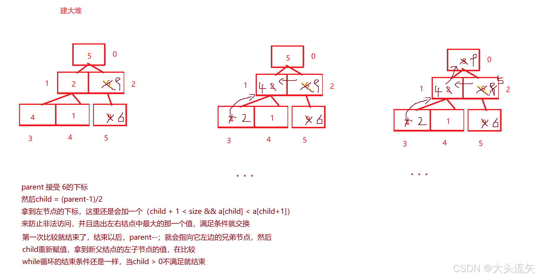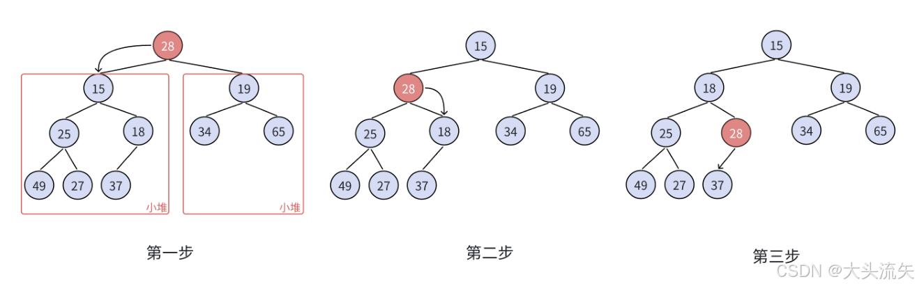 - 调整方向:自上而下,当前节点和左右子节点比较交换。