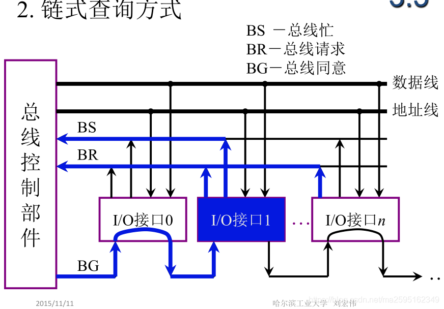 I/O接口通过BR向总线发起请求,只有在BS信号未建立之前,BR才能被总线控制器响应,并送出BG回答信号。BG信号串行地通过每个部件,如果某个部件本身没有总线请求,则将该信号传给下一个部件,直到找到对应的部件。根据查询方式的优先次序,在查询链中离总线控制器越近的设备具有最高优先权。