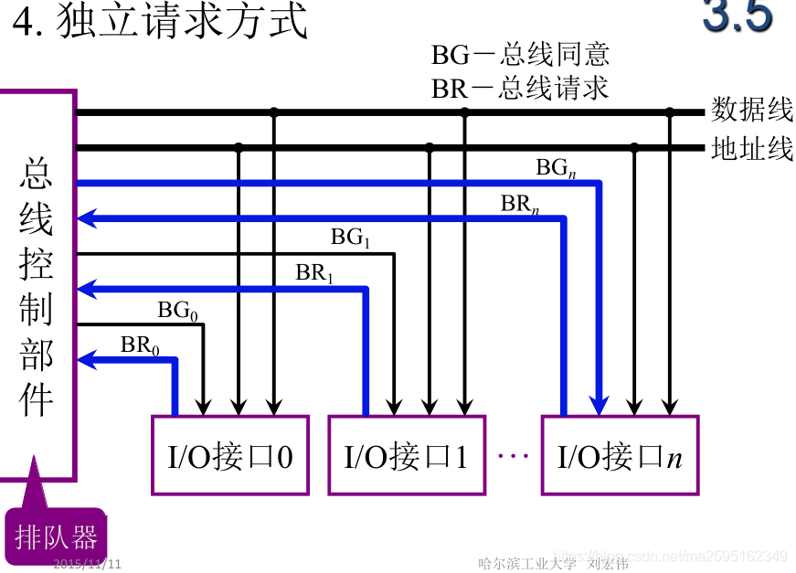 每一个共享总线的部件均有一对控制线。当某个部件请求使用总线时,便发出BR,总线控制器中有一排队电路,根据一定的优先次序决定首先响应哪个部件的请求。