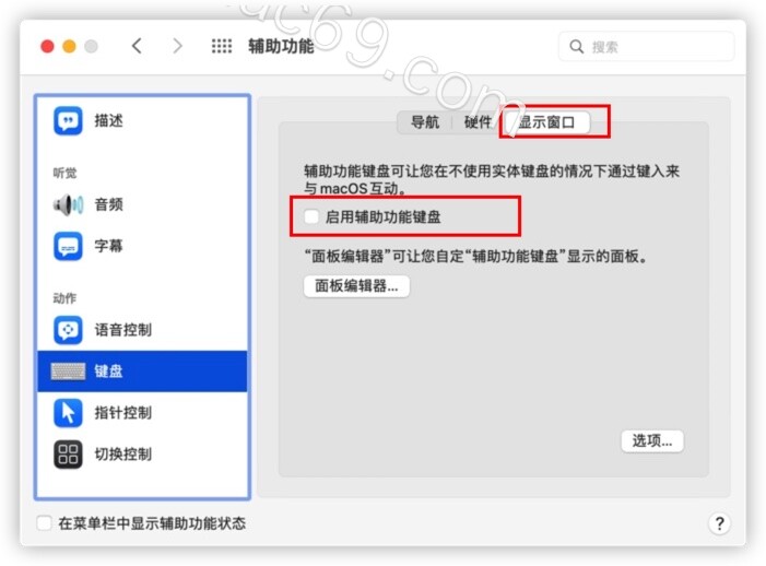4、在窗口右边,切换到“显示窗口”界面,勾选上“启用辅助功能键盘”,然后右下角的“选项”可对辅助键盘进行设置。