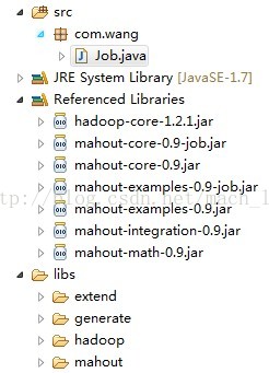 在eclipse下新建java工程,导入开发mahout所需的jar包,如图所示