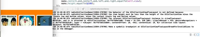 2016-03-28 14:48:48.874 radishCollectionDemo[15894:278708] Make a symbolic breakpoint at UICollectionViewFlowLayoutBreakForInvalidSizes to catch this in the debugger.