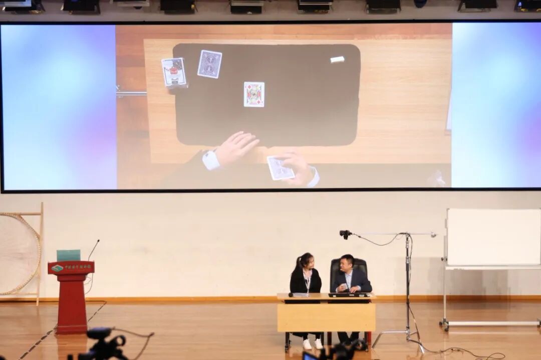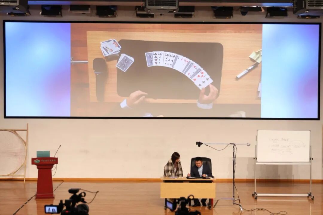 开场除了前两句话有点紧张外,其余都很顺,毕竟内容早已熟透。而教学部分则毫无意外地又出意外了。后来复盘发现是张老师在展示牌堆时,把牌弄乱了顺序。看来我避免叫小孩子上来配合的措施还不太够,选人和流程上依旧有功夫要下。比如这里这一步本就有被展开弄乱风险,要么再强调,要么出于安全考虑得省略的,这些压箱底的数学魔术作品没有充分的实战就是会有这些问题。