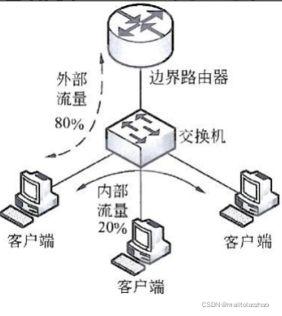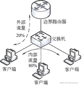 3.通信流量分析方法:80/20(适用于内部交流较多、外部访问较少的网络)、20/80规则(适用于外部交流较多、内部访问较少的网络)
