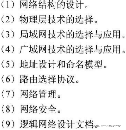 4.逻辑网络设计工作主要内容如下:逻辑设计过程由确定逻辑设计模板、网络服务评价、技术选项评价、技术决策4个步骤组成;逻辑设计根据用户的分类和分布,选择特定的技术,形成特定的网络结构,大致描述了设备的互联及分布情况,并不设计具体的物理位置和运行环境