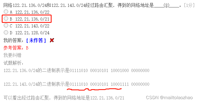 4.路由汇聚例子:取两条路由的二进制的公共部分,即可进行路由汇聚,如下图所示: