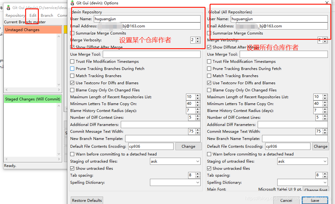 方式二:使用GUI方式:git gui here >>edit>>options>>设置即可