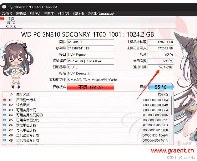 在网上查看了这块硬盘的参数,耐久度是400TBW,咨询做硬件的朋友,用CrystalDisklnfo查看了一下硬盘信息,一看吓一跳,总计写入已经达到了570多T,,通电时间才7481小时(311天,不足一年),,,