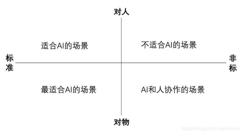 跟任何解决方案一样,AI能力也有自己的适用范围。这里借鉴车马的观点,从服务对象和服务内容两个维度对AI能力适用度进行区分,其中服务对象分为对人和对物,服务内容分为标准和非标,划分如下: