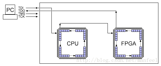 Inside each JTAG IC, there is a JTAG TAP controller. On the figure above, that means that there is a TAP controller in the CPU and another in the FPGA.