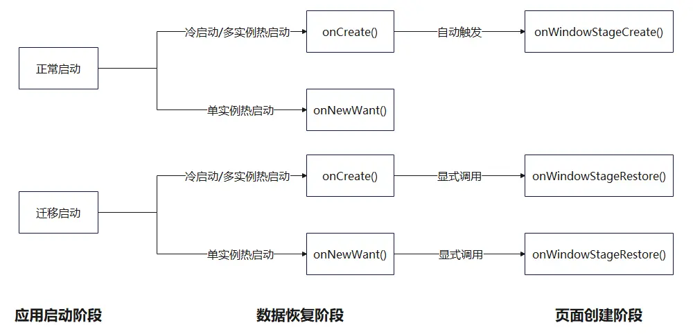 | onCreate(want: Want, param: AbilityConstant.LaunchParam): void; | 接续目的端为冷启动或多实例应用热启动时,在该回调中完成数据恢复,并触发页面恢复。 |