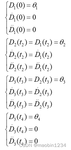 机械臂各个关节通过起始点β1,路径点β2、β3和终止点β4时,β1和β4处的速度和加速度均为0,其他插值点重合处的速度和加速度应相等。