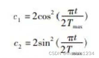 3、将局部和全局的学习因子c1和c2联合起来。当增大c1时,会增强粒子的个体认知能力,但是收敛速度缓慢;当增大c2时,会增强粒子的社会认知能力,收敛速度迅速,但是极易使算法早熟。为了保证PSO算法的搜索能力和协调粒子的个体认知和社会认知能力,采用动态调整学习因子的方法,将学习因子的取值与粒子当前的迭代次数联系起来。在搜索初期粒子个体的搜索意义大于全局的搜索意义,所以c1>c2;在搜索后期为了更加快速地获得全局最优解,应增加粒子与种群之间的交流,所以c1<c2。其函数表达式为: