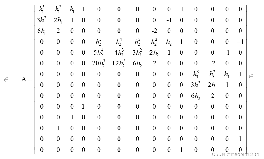 由于已知各个路径点的位置和各段轨迹所需要的时间h,可以得到的系数矩阵为: