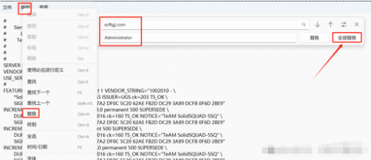 10.点击【编辑】选择【替换】,输入查找内容【softgj.com】,在【替换为】处输入自己的“计算机全名”,点击【全部替换】。
