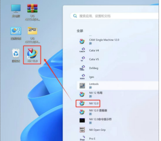 33.创建桌面启动快捷方式:点击桌面左下角【开始】图标,点击【所有应用】→找到并拖动【NX12.0】图标到电脑桌面。