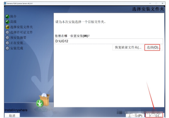 15.点击【选择】可更改安装位置(建议不要安装在C盘,可以在D盘或其它磁盘下新建一个“UG12.0”文件夹,注:安装路径中不要有中文),点击【下一步】。
