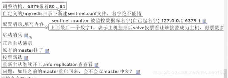 哨兵模式顾名思义就是反客为主的自动版,它会自动的监控主服务器的运行状态在主服务器出现宕机情况后实行投票机制从剩下的从服务器中选出一个升为主服务器继续执行程序并监控,等原先的主服务器修复后重启后自动添加为slave: