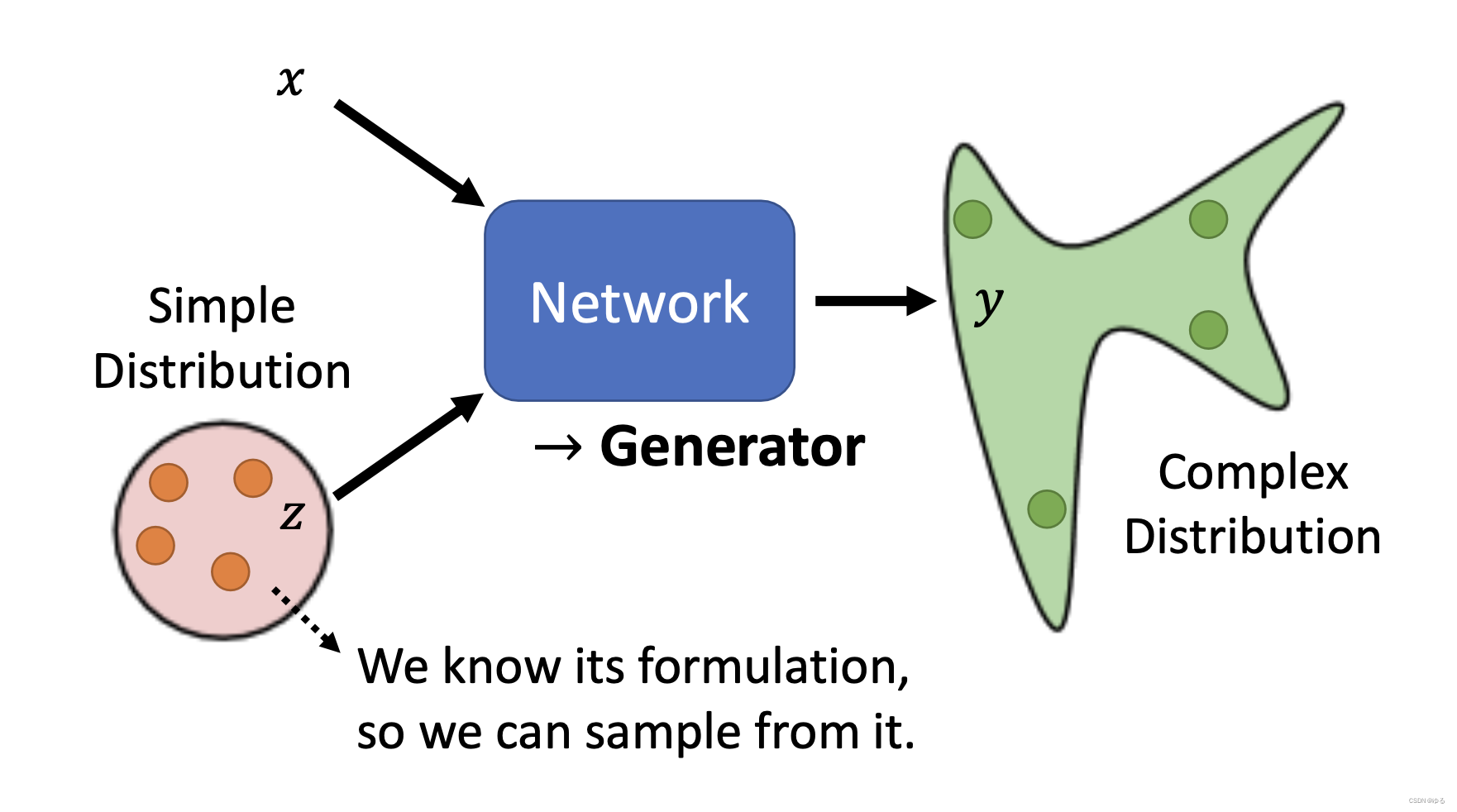 生成器将一个输入通过神经网络产生一个概率分布,通常用于具有创造性的任务,即一个输入对应着不同的输出,比如给生成器输入红眼睛的角色,输出是具有红眼睛的不同的动漫角色。
